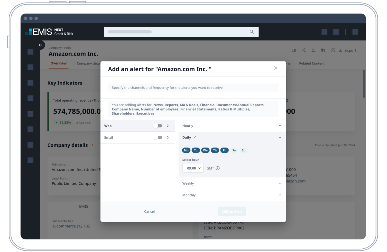 Track and monitor companies in your portfolio over time with news reporting and customised alerts.