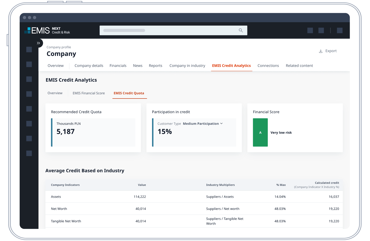 Generate credit scores and recommendations of credit quotas customised to your own policy. Export data directly into your own templates and refresh it automatically.